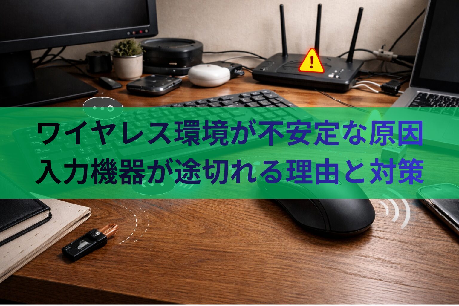 ワイヤレス環境が不安定な原因は、単純な故障ではなく、電波干渉・受信機の位置・接続機器の密集・電源状態が重なっていることが多いです。入力機器だけでなく、デスクまわり全体を見直すと改善しやすくなります。